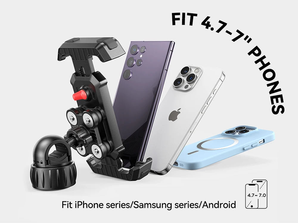 The bicycle accessory is compatible with all 4.7-7 inch cellphones, perfectly for iPhone 17/16/15/14/13/12 or Samsung S25/24/23/22. Whatever your phone is, it can be placed on our bike phone stand