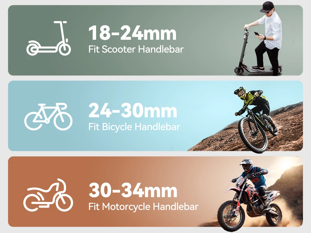 JOYROOM bike phone stand fits the round handlebars of 0.7-1.34 inches, compatible with motorcycles, bicycles, scooters, electric bikes, sled vehicles, etc. PS: Not suitable for flat handlebars/profiled handlebars